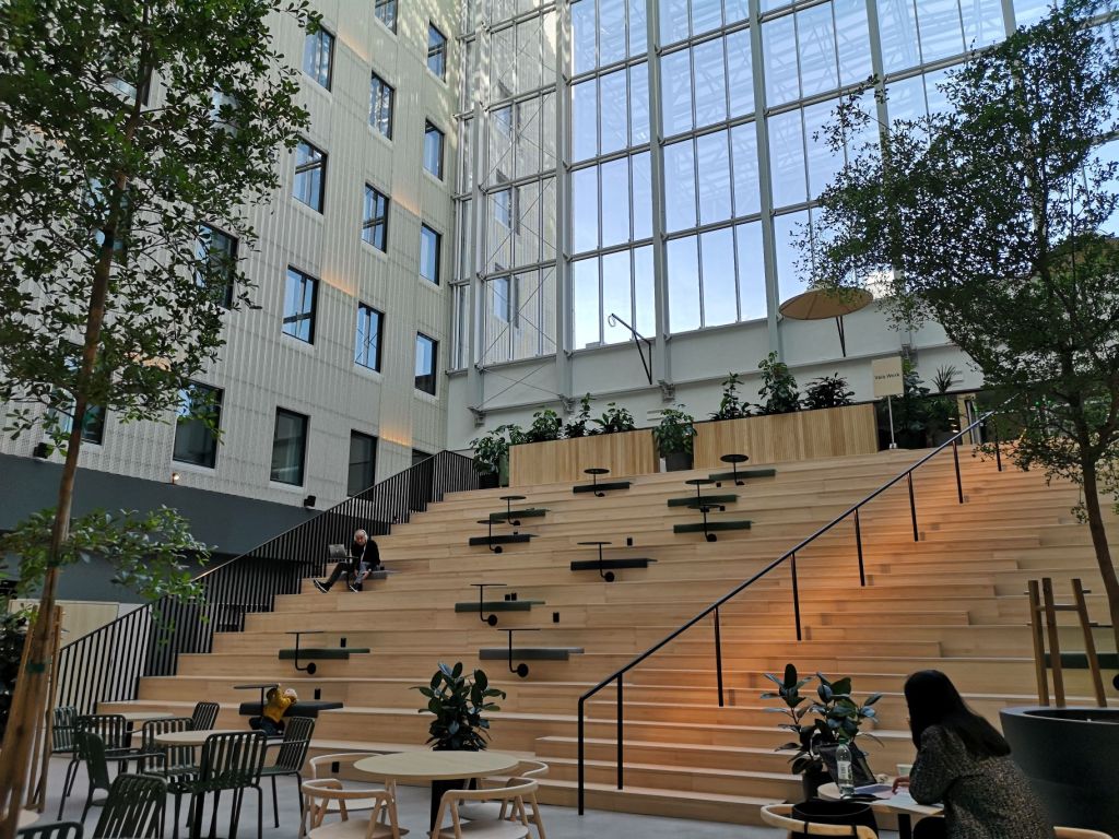 Ulkoapäin rakennus ei herätä kummoisempia tunteita, mutta sisälle kun astuu, niin koko rakennuksen korkuinen valoaula vangitsee katseet. Muutamia läppärityöläisiä istuskelee terassipenkeillä ja tunnelma on sekoitus ruotsinlaivaa ja korkeakoulua. Aulasta pääsee myös hotellin ravintolaan, joka näppärästi toimii aamuisin aamupalapaikkana, päivisin lounasravintolana ja iltaisin a-la-cartena. Toki baarikin löytyy simasuille!🍹