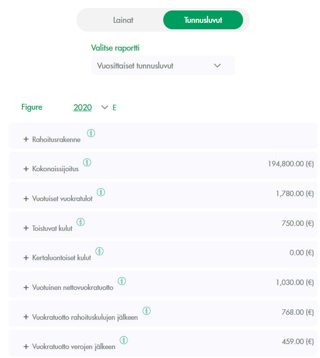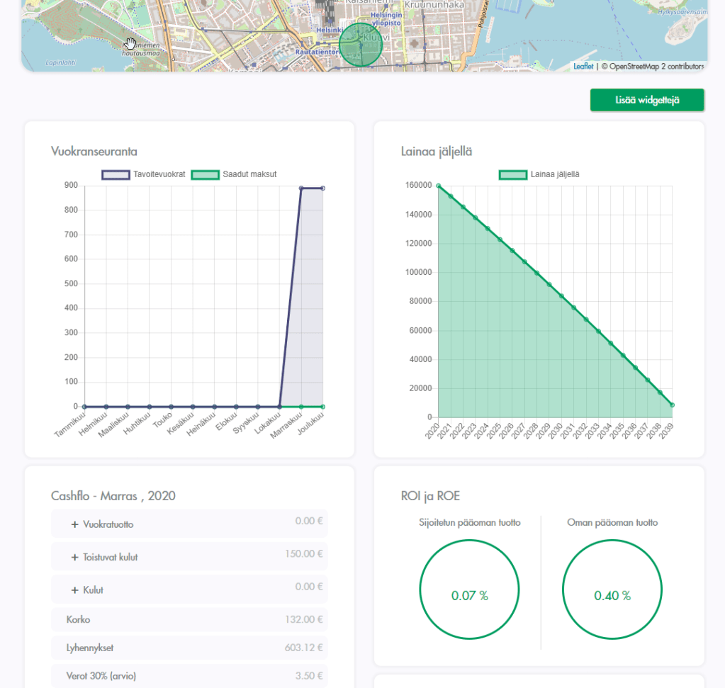 Palvelu havainnollistaa kivasti asunnon sijainnin kartalla ja tarjoaa käppyrää moneen lähtöön niin vuokrien kuin lainojen seurantaan. Myös perusmittarit (ROI & ROE) ovat helposti saatavilla, kuten myös kohteen kassavirta veroineen päivineen. Koska palvelu on suunnattu ensisijaisesti useamman asunnon omistajille, yhteenvetoraportit varmasti kiinnostavat esim. veroilmoitusta täydennettäessä tai miksei muutenkin: