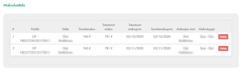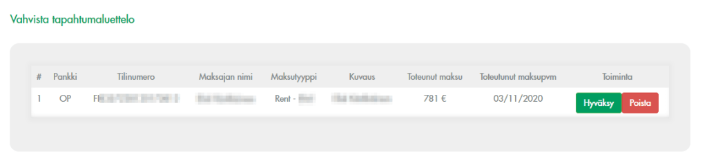 Jos maksu on ok ja hyväksyt sen, se siirtyy ”reskontrasta” kirjanpidon puolelle, eli näytetään kaavioissa toteutuneena maksuna.