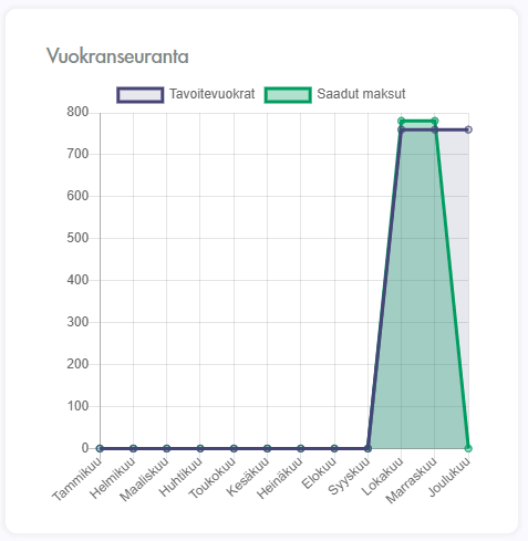 Kun maksutieto on olemassa, kohteen tiedoissa voi nätisti seurata, miten vuokria on maksettu ja onko niitä kenties rästissä, kokonaan tai osittain.