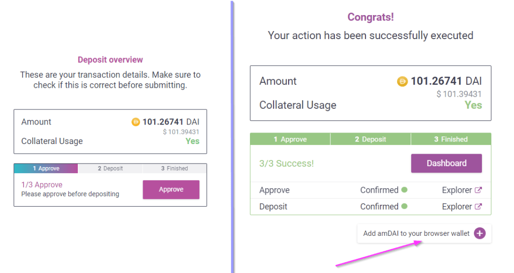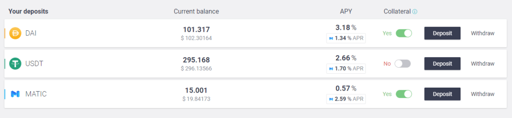 Miten sitten tuo tuotto maksetaan? Sepä onkin Aaveessa kiehtovaa, sillä kryptoposition koko kasvaa reaaliaikaisesti! Eli jos tarpeeksi pitkään jaksat katsoa, niin numerot lompakossa (tai Aaveessa) raksuttavat pikku hiljaa ylöspäin. Jos katsot tarkkaan ensimmäisen kuvakaappauksen DAI-saldoa (101,267 $DAI) ja tuota yllä olevaa (101,317 $DAI), niin onhan siinä jo viitisen senttiä tullut lisää. Bonus-tuotto (AAVE:ena tai MATIC:na) pitää erikseen claimata Aaveen dashboardista).