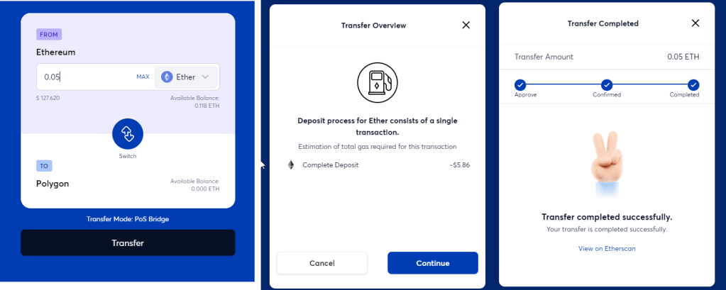 Seuraavaksi ETH:t pitää siirtää Polygon-verkon puolelle. Tämä onnistuu helpoiten Polygon Web Wallet -palvelulla. Klikkaa Move funds from Ethereum to Polygon -namiskaa ja valitse siirrettäväksi tokeniksi Ether. Syötä haluttu summa ja hyväksy siirto. Metamask-lompakko avautuu popup-ikkunaan ja sieltä joudut vielä pari kertaa (ensin sign, sitten spend) hyväksymään operaation.