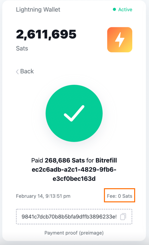 Summa on niin pieni, ettei sitä edes malta ajatella – noin kymmenesosasentin luokkaa. Mutta ei tässä vielä kaikki! Kun sitten aikani tutustuin lisää salamaverkkoon, törmäsin Twitterissä zero fee routing -solmuun, joka tarjoaa ilmaisia salama-maksuja. Eikun kanavaa auki siihen suuntaan ja kokeilin ostaa uutta lahjakorttia Bitrefillistä, tällä kertaa vähän isommalla summalla (100 €).