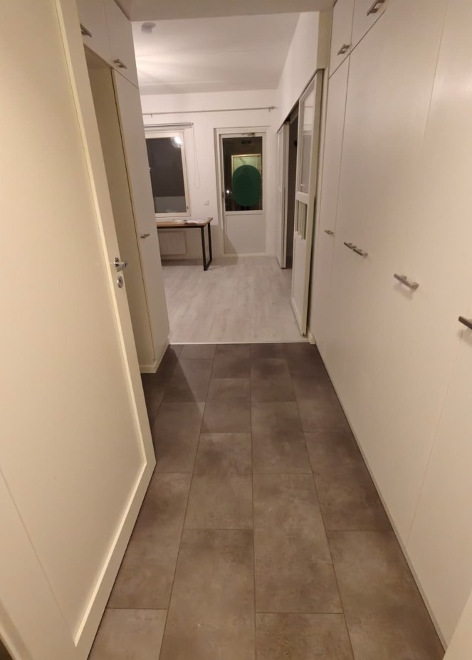 Seuraava osallinen olikin sitten alakerran naapuri, joka otti yhteyden kiinteistöhuoltoon huomattuaan kosteutta pukkaavan katon läpi. Suihkuvedet olivat lähteneet valumaan eteistä pitkin ja huolto oli heti ryhtynyt suojaaviin purkuoperaatioihin. Muutaman päivän sisällä kosteusmittaukset oli tehty, joiden mukaan uusiksi menevät niin yksiön parketti, eteiset kaapit ja osa keittiön kiinteistä kalusteista. Koneellinen kuivatus aloitettiin myös saman tien.