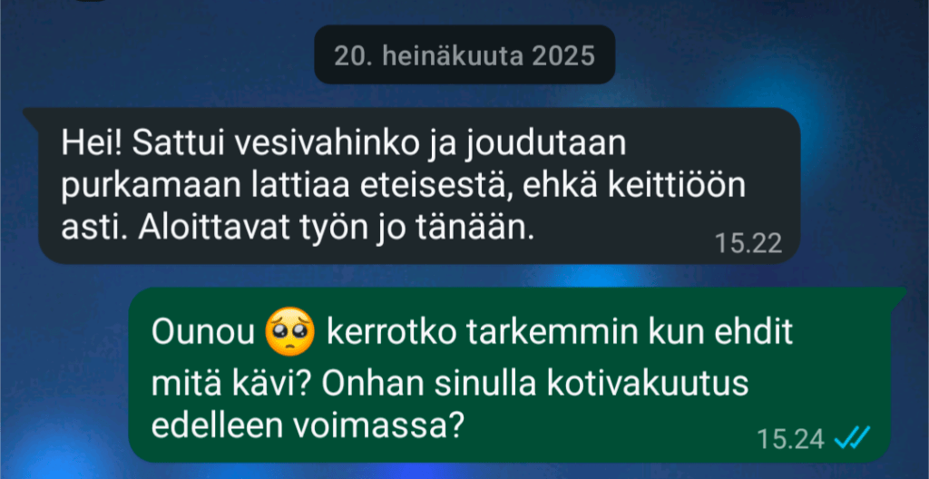 Oli muistaakseni joku heinäkuun lämpimistä lauantaipäivistä, kun vuokralaisemme laittoi viestiä (kts. ruutukaappaus). Yleisestikin ottaen yhteydenotot vuokralaisilta vähän säpsähdyttävät, ne kun yleensä tietävät harmia joko irtisanomisen tai jonkun ongelmatilanteen muodossa. Mutta vesivahinko kutittelee ihan omalla tavallaan! 🤌🏻