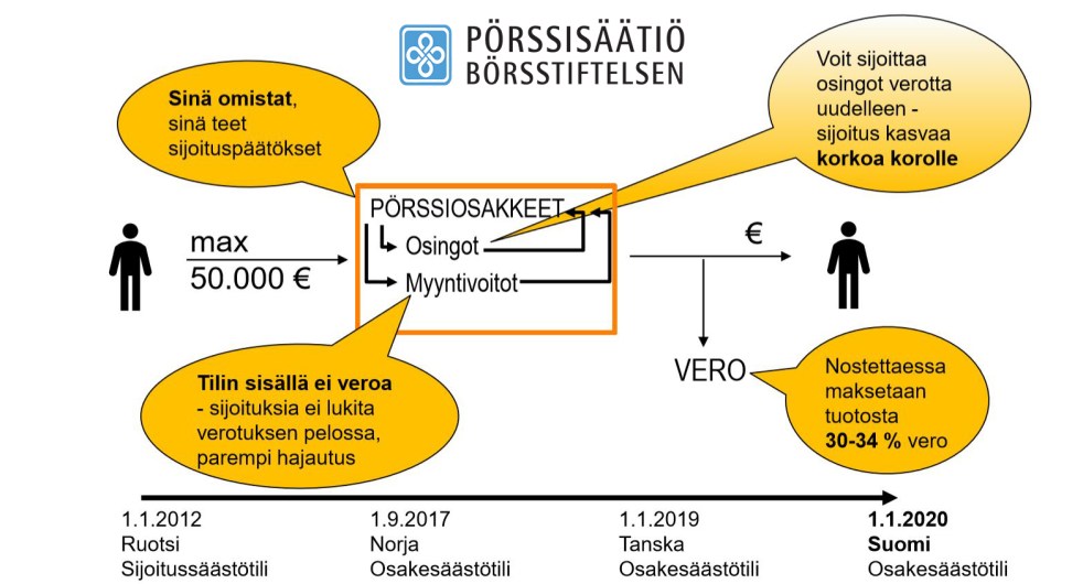 Elämme jänniä aikoja – toki poliittisesti tai mitä kukin meistä itse seuraakin – mutta myös suomalaisen osakesijoittajan näkökulmasta, sillä ensi vuodenvaihteessa tapahtuu merkittävä muutos osakesäästötilin astuessa voimaan. Jaa osakesäästömikä?! Jos kyseessä on uusi tuttavuus, niin suosittelen tutustumaan esimerkiksi Pörssisäätiön yhteenvetoon, mutta lyhykäisyydessään kyse on uuden muotoisesta arvo-osuustilistä, jonka perusperiaate on seuraava: Osinkoja ja luovutusvoittoja verotetaan… Jatka lukemista Onko osakesäästötilistä hyötyä minulle?